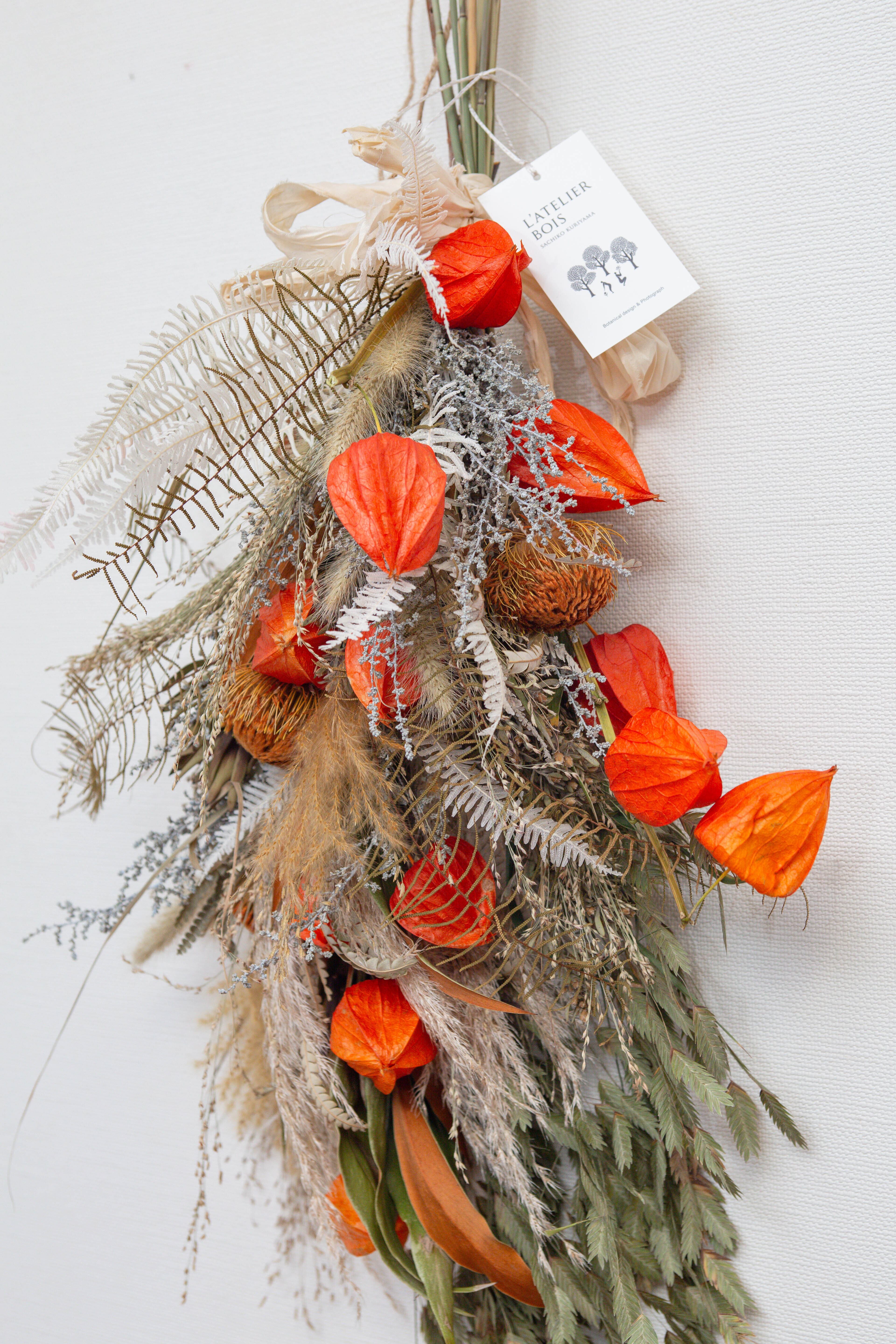 ホオズキ、アンドラ、グレビレアゴールド、ススキ、シダ、パンパス、他乾草